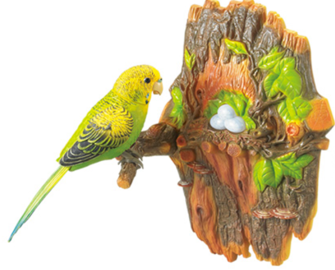 Place your hand near the bird or its tree branch—it chirps, flaps its wings, and moves its head in response to warmth! -