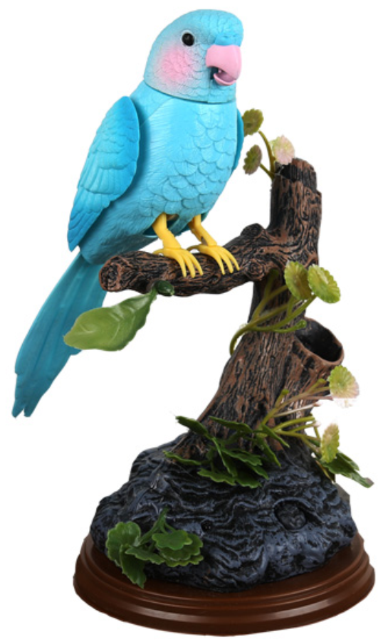Place your hand near the bird or its tree branch—it chirps, flaps its wings, and moves its head in response to warmth! -